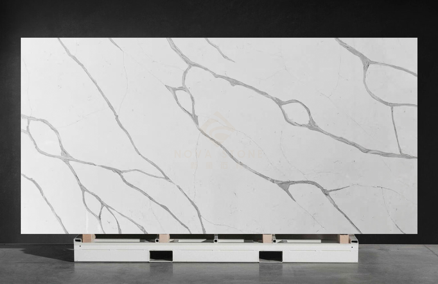 The Untamed Peak Imagine the silent power of a mountain’s snow cap, where the wind has carved deep, branch-like fissures into the ice. NV834 is not merely a surface; it is “frozen energy.” Its stark white background provides a clean, expansive canvas for the dramatic grey veining that sweeps across the slab with intentional, organic intensity. This is Calacatta at its most sophisticated—bold enough to anchor a room, yet refined enough to maintain architectural balance.